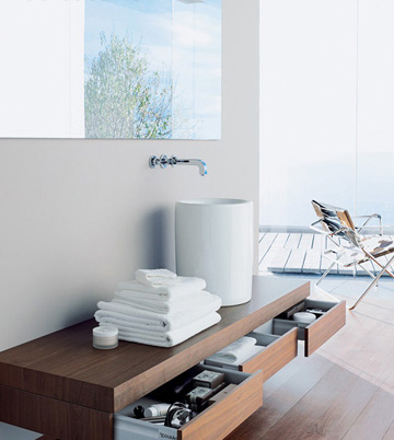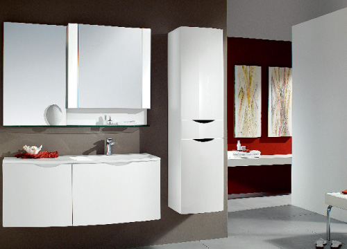 10.弧形设计提高使用舒适度 人站在浴室柜旁边,经常会欠身照镜子或者拿镜柜中的物品,设计为弧形的浴室柜在人们做这两个动作时不会形成障碍。此外,如果突然拉开下面的抽屉时,也不会因为躲闪不及而磕碰到腿部,安全系数大大提高。 11.层板样式拿取容易 如果你平日里追求简单的生活,没有那么多瓶瓶罐罐的化妆品,安装一款这种层板样式的浴室家具就完全够用了。轻盈的结构不会在浴室形成拥堵效果,漂亮的毛巾或者浴液摆放在上面还是一种装饰。层板上的物品容易拿取,注意物品摆放要稍微讲究些,以免凌乱影响整体效果。