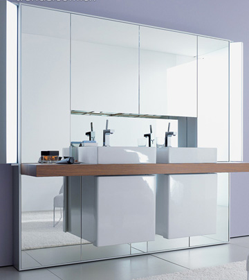 13.镜面墙功能全集合 如果不想一件一件安装脸盆、镜子、储藏空间或灯,令墙面四分五裂,可以选择镜面墙集合浴室柜。它将所有这些元素都组合成为一个整体,视觉上更简洁。打开后,所有的浴室日常用品收纳在被固定在门上的樱桃木盒子里,取用十分方便。隐藏的边柜内设有电源插座,提供额外的实用储藏空间。