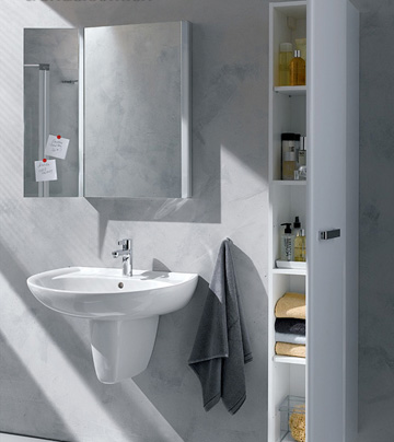 14.苗条高柜满足小空间使用需求 面积小的浴室内,很多人不敢使用浴室柜,觉得用各种吊篮、横杆更能节省空间,可是结果恰恰相反。所有物品暴露在外面,凌乱不堪。这款苗条形的高柜,安装在洗面盆旁边,收纳能力极强,内部层板分隔不同物品,如果搭配使用一些盒子等小型储物工具,收纳效果会更出众。