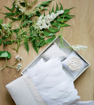创意窗帘环 主要装饰材料:干芸豆、干桂圆 窗帘上的窗帘环,用久了会觉得有点过于平淡,可以自己动手改造它。用万能胶和线将干芸豆或干桂圆按序粘缝在窗帘环上即可。 甜美礼物包装 主要装饰材料:白色羽毛、棉布装饰带 赠人玫瑰,手有余香。既特别又精致的包装,让我们在送别人礼物的时候显得更贴心、更有品位。纯白色的羽毛与棉质的布料结合起来,立刻营造出一派自然气息。