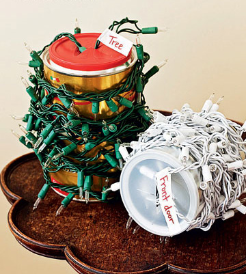 节日的串灯非常提升气氛,收纳起来却是非常烦人。不妨将废弃的瓶瓶罐罐收集起来,在盖子上切一个X,把彩灯的电源插头塞进去,盖上盖子,把串灯仔细绕在罐身上。贴好标签注明彩灯用途,比如挂在圣诞树上还是挂在前门上。这样,既保证了整洁,又保证了串灯的完好。 |