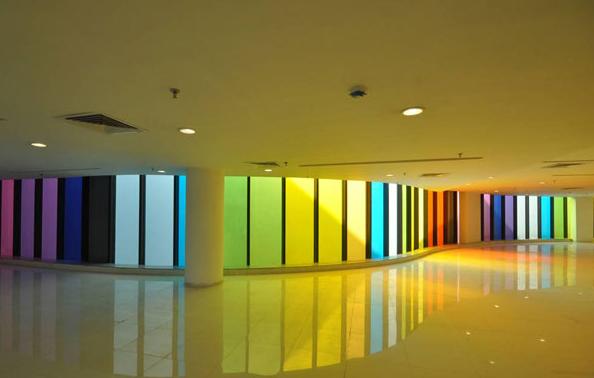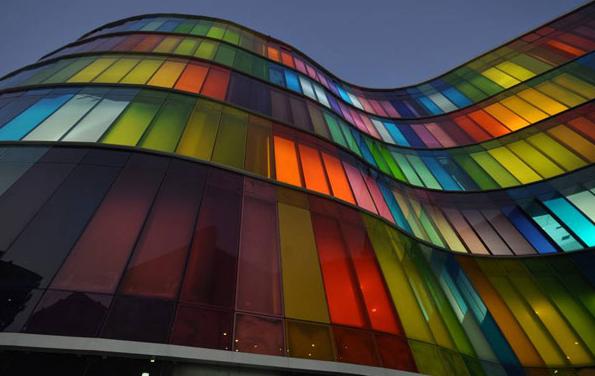 加尔各答(Kolkata)是位于印度东部的一座古老城市,本身没有什么建筑特点,随着时间推移又变得越来越混乱和单调化。但是居住在这座城市的人却对艺术和文化有着很深的热爱。 为此,国际管理学院(International Management Institute)要求建筑师设计出一座更有表现力、富有活力和高科技的可持续性建筑,并以色彩给城市生活增光。 场地位于一个密度很高的居住区,场地条件十分局促,只能直线型排列。为了减少这种排列带来的单调感,玻璃立面色彩鲜艳,并以两层5mm的玻璃组成,每一层都有1.2mm的PVB涂层,以便减少阳光给内部空间带来的热量。到了夜晚,屋内点灯之后,立面显得更加夺目,映射在下面的广场上。 这座建筑不但为学生也为老师设定了可以交流的场所。接待区高三层,以巨型天窗引入自然光照。图书馆的三边都是玻璃,旁边种植的大树为其遮挡阳光。除了立面,内部空间也以不同颜色的玻璃来分区,甚至家具也用色彩丰富的玻璃来做装饰。 (责任编辑:水晶) |