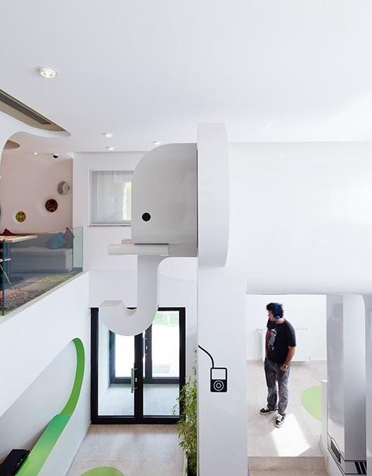 Phill 游乐餐厅(Phill Playground & Restaurant)位于罗马尼亚首都布加勒斯特(Bucharest),是一个为家庭聚会设计的地方。 这里有孩子们喜欢的游乐设施,多功能房间以及首层小的咖啡厅和二层的餐厅。活动场地与多功能房间是一个可封闭的区域,那里有独立的照明和视听系统,可容纳剧院、上演木偶剧、举办芭蕾课程等功能。 Phill 游乐餐厅(Phill Playground & Restaurant)由罗马尼亚设计师Nuca Studio设计。顾客将他们的孩子安置在首层的活动室做游戏,他们便可在一座4米高可爱的大象模型旁的餐厅进餐。大象跨在主要楼梯的中央,仿佛在用身上画着的MP3播放器中欣赏音乐。