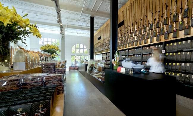 玛格丽特河巧克力店位于澳大利亚的珀斯,这是由前爱德华七世的银行改建而成的,灰色水泥幕墙被改建成巧克力店面,在宽敞的室内空间内展示出五颜六色包装的巧克力和美味的食品。