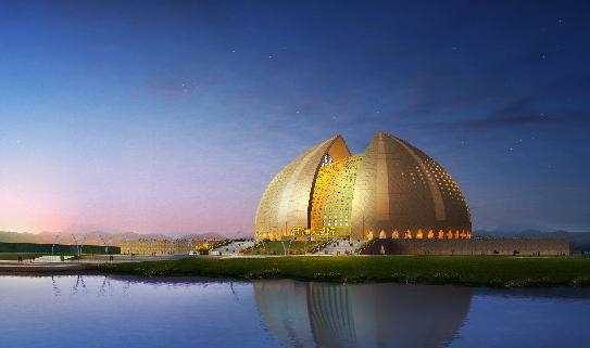 方案以天山雪莲为原型,通过抽象与创新,形成里外层套的穹顶造型的主体形象。主体建筑坐落在平缓的台基上,神似一朵天山脚下的含苞欲放的雪莲花。大剧院外饰面通过黄褐色金属光泽的材质表达出轻盈、时尚的品质,内核金色砖纹肌理表达出浓烈的新疆文化特征。
