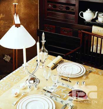 7.用餐人数较少时,落地灯也可以作为餐桌光源,但只适用于小型餐桌。选择落地灯款式时要注意跟餐桌的搭配,锥形灯罩调和了正方形餐桌带来的凝重感觉,使就餐区域多了几丝轻松和随意。同时,木质的灯架也和餐桌上米色东方风情的桌布、餐巾、银烛台、白色餐盘和银质刀叉一起打造出温暖的就餐气氛。