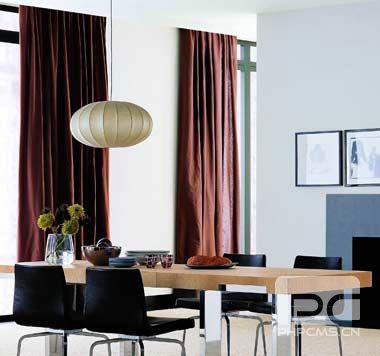 2.加长的餐桌适合面积较大的餐厅使用,显得大气。同时,在大空间中更要注意色彩和材质的呼应,否则容易显得松散;原木色餐桌面跟咖啡色厚绒窗帘、浅褐色羊毛地毯颜色十分协调,餐桌腿所用的金属材质跟餐椅腿也有所照应,整体性由这些细节而得到加强。