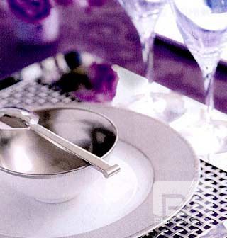 9.布置一张令人愉悦的餐桌,餐具和餐垫等细节也不能忽视。镀银餐垫十分特别,突破常规的材质,让它当仁不让成为餐桌焦点,同时,餐碗内壁镀银装饰和餐勺、叉子所用的材质也形成呼应。这种餐垫在Christofle有售,相比较一般的餐垫,金属餐垫不易磨损,也更个性化,但售价要贵一些。