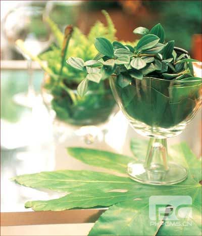 透着生机的玻璃花瓶 利用透明玻璃杯养些喜阴的蕨类或绿叶植物,放在向北的厨房也能很好地生长。整齐地摆放在窗台上会给厨房带来一份活力和生机。