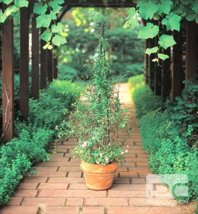 过道里的绿色营造 长春藤、菱叶藤等藤类植物很容易营造出装饰性气氛。你只需找些木棍、铁棍和麻绳做出造型,引导它们生长的方向。而让根部充满绿叶的诀窍是给树叶喷些水溶性肥料。
