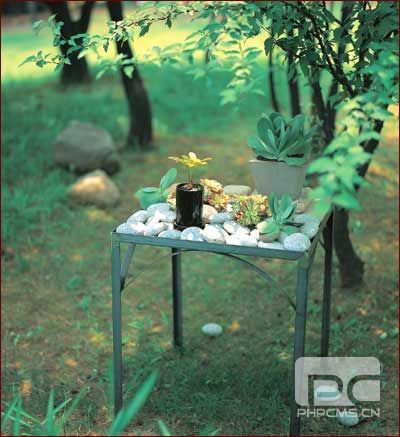 在铁架上搭一块木板,放几个小花盆,堆满石子,再种几棵耐干旱性植物,就成了一个具有沙漠风情的迷你花园。耐干旱性植物有丰富的水分,十天、半个月浇一次水也能很好地生长。