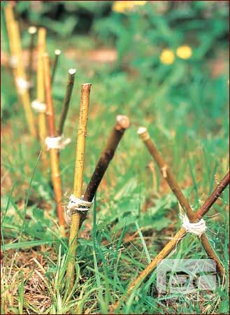 两根中等粗细的树枝折成适当的长度,“X”形叠放,铁丝固定后用绳子捆绑,就可以构架出实用的迷你栅栏。 |