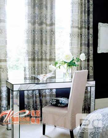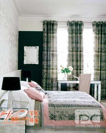 含有一定灰色的烟粉色是今年大热的时尚风潮色,与灰黑色抽象大花图案搭配自然谐调,充满中性的时尚韵味。壁纸、窗帘、床品上搭配经典的复古花纹,保留了雅致的淑女风范,靠垫上的蝴蝶结和水晶珠装饰是复古元素的时尚演绎,而线条简约的镜面家具更平添了一份时尚味道。