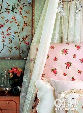 如果你觉得床头柜上放台灯、蜡烛、鲜花,以及在墙上挂画之类的床头装饰基础法则都不够浪漫,那么,试试看为你的床头披上一袭白纱。把白色通花纱帐的顶部在天花板上固定好,再将纱幔的大部分塞到床靠后面,只留一小部分自然下垂于床头,调整一下纱帐的形状,让床头半隐半现就可以了。 [page]