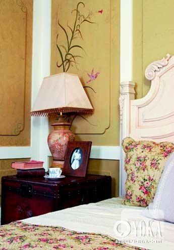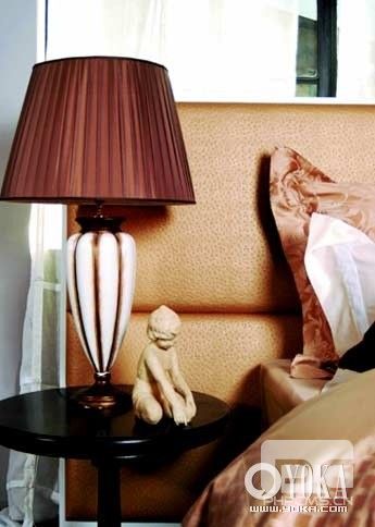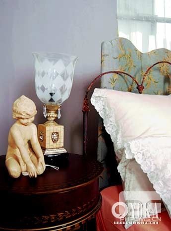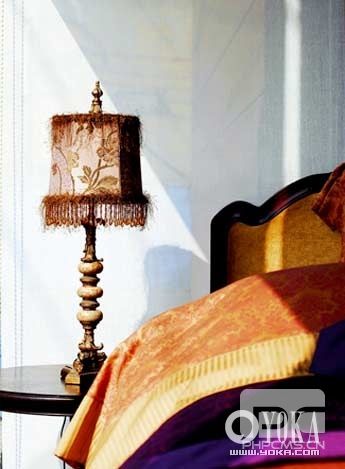 床头的装饰首先必须跟床本身的色彩和风格相协调。比如,复古风格的床适合搭配金色或紫色系的床品,跟床头的金色靠背应和,营造出一派低调的华丽。考虑到床头的色彩已经很丰富,所以边桌上的摆饰不必多,一个式样典雅的台灯就够了。灯罩上的刺绣和坠珠流苏亦为床头增添细节。