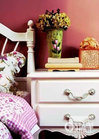床和床头柜成套购买固然省事省心,又不容易出错,但如果想要一个独具一格的床头,最好还是多花点心思。深褐色绘花箱式床头柜搭配乳白色床架,在色彩上形成鲜明对比,犹如诗歌中的韵律,起伏跌宕,反而比白色更出彩,碎花床品衔接了两者的色彩关系,更突出了整体和谐度。 [page]