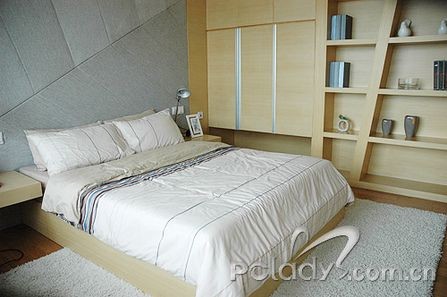 [page] 二、主卧--收藏阳光的空间 当经过那条过道的时候,就能分明的感觉到卧室里阳光的“密度”,果然,主卧室就是个收藏阳光的地方。这里没有繁琐的设计与装饰,衣柜和装饰架都好好地“搁置”在墙体上,没有霸占主人睡觉的空间。大大的玻璃窗,一刻也没停歇地迎接阳光的到来……
