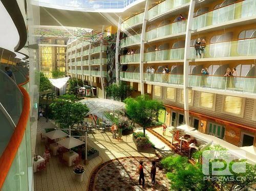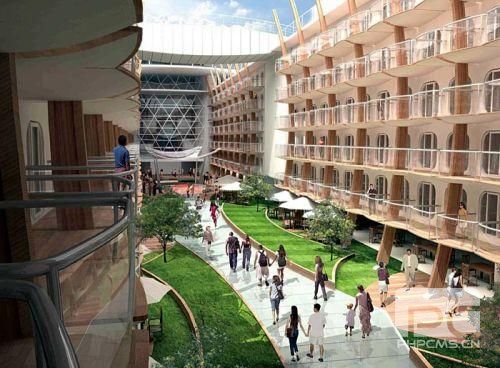 从模拟实景图来看,“中央公园”位于邮轮中心,四周为6层高的船舱所环绕,类似一块天井。但这块“天井”长度相当于一个足球场,其间小道蜿蜒,绿意葱茏。
