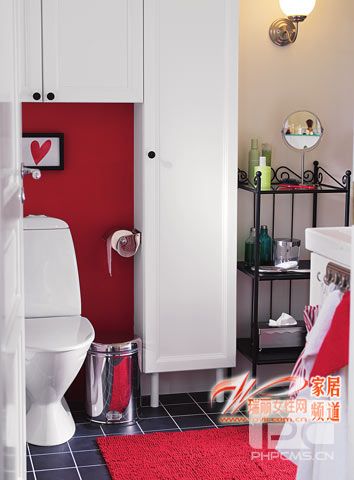 坐便器周围的细碎收纳--巧妙收纳 清洁用品+卫生纸+书报杂志 卫浴间虽小,也要整理得井井有条。为了让如厕的过程更愉快,周围的空间收纳更应该好好规划一下。 坐便器上方的吊柜,将小卫浴的立体空间利用了起来。旁边的不锈钢制桶收纳垃圾。白色的洁具与红色背墙以及地毯形成强烈对比,视觉上呈现小卫浴的完美空间。 [page]