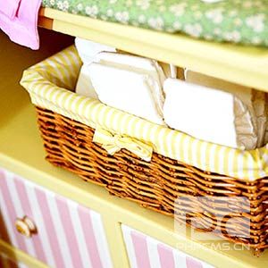 巧用篮子 把东西放在开放的货架上,可以得心应手,特别是当照顾一个新的婴儿。在这种敞开的篮子里,有黄色条纹织物,尿布等,保持在人们触手可及的桌子。