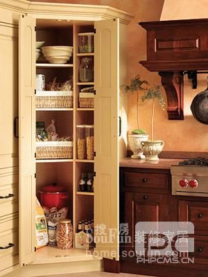 坐落在一个角落里,这茶水橱柜提供的货架和小空间可容纳很多东西,从意大利通心粉到大浅盘子。简单的和精美的常用橱柜使得酒和单独的 面板成对地放在最上面的一层,表面是低光泽亚麻。