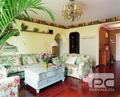 F、设计心得: ①色彩、图案:客厅沙发与窗帘的颜色采用相呼应的冷色(蓝色),让空间有更开放的感觉。图案选择乡村风格的典型元素条纹及花朵,使整个空间既有乡村的质朴而又不失时尚的味道… ②走廊护墙裙上贴的水移画:其花朵图案与顶上花朵形状的吸顶灯交相呼应表达了一种向往自然、田园的感觉。 ③不同圆拱造型的垭口让空间与空间的过度更流畅。