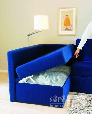 5、沙发也是储藏箱 沙发不仅可以变成床,也可以“变身”成储藏箱,帮助主人存放平时不用的被单、衣物。只需要提一下手拉带,沙发的内部空间就可以展露眼前。