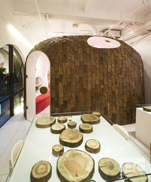 刚才说的是,这是今年刚做的在上海蒲蒲兰本馆,它的设计跟以前不一样,主要的材料是树皮,这是从外立面看的效果,在一层有书店,二层也是看书的地方,然后以及工作人员的办公室。这是一层的内部空间,书架是通过不同形状和造型摆放出来的,每一个书架每一个小箱子的材料也是不同的。在吊顶上挂的是一颗颗的树。在里面的墙上是一个可以转的木转盘,这是二层的办公室,它这个是把不同大小、不同高低的水桩放在中间,作为整个看书的空间。然后这个里面也是人员可以在里面看书,在空间的外面大家可以看到是用的树皮,整个形状就是一个大的树洞,这个是从树洞里面往上看的形式,在里面这样的造型是一个通道,又是可以看书的小台子。这个地方不知道大家有没有看出是什么地方,卫生间,让人一进去有点吓一跳的感觉。墙面吊顶上都用了不锈钢。