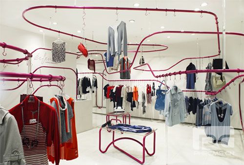 这个是成都伊芙丽的时装店,时装店最重要的元素是钢管。一根钢管在整个空间不同高低的缠绕和方向的变化组成的,就像指挥家他挥舞手中的指挥棒所画出来的弧线,这是它的里面。他的入口也是由钢管缠绕出一个入口的形状,这是进去以后的感觉。它这个钢管的高低,有的高,有的低,实际上造型也是根据不同人的身高设计的,考虑购物的方便。当然挂在高处这个衣服,人不会去取的,只是用来展示。这个店有5家店,从第一家开始,钢管的复杂性由业主的要求,越来越复杂。这个钢管我们从视觉上看,感觉是悬浮在半空中的,实际上是有顶部、吊顶分别用亚克力接起来的。这个钢管的造型也是非常花人工的,在中国做这种非常花人工的造型,成本又不会太高,做出来的效果也是不一样的,世界各地的人都会觉得很吃惊的。