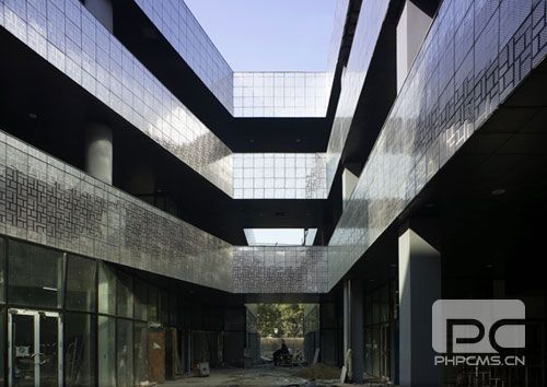 这个是在北京三里屯做的商业设施——北京格子,立面用的是金色的金面不锈钢,在不锈钢的外侧做的是铁网。