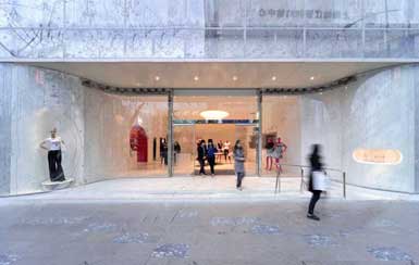 商店大堂呈珍珠红色,曲形表面,大堂内电梯也是粉色的,二层是两层高的主要展示区。 |