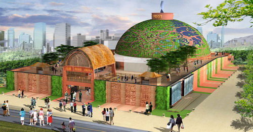 “小”展馆融合“大”景象 上海世博会印度馆面积4000平方米,设计灵感全部源自印度最古老、最气势恢宏的建筑。展馆的圆拱形大门,建筑灵感来自位于艾哈迈达巴德的“Siddi Syed”寺;广场地面为陶土与青石修建,灵感来自瓦那纳西的兰浦尔宫殿,通过内置水管实现制冷;中央穹顶象征着印度“万象和谐”的主题,设计灵感来自桑奇佛塔,是印度教、佛教、伊斯兰教、耆那教、锡克教以及基督教中经常出现的建筑风格,让参观者宛若置身于佛法圣地,找回内心的宁静。 印度馆设计师之一Naidu表示,古色古香的印度馆其实内含高科技元素。印度馆使用的建筑材料大部分均为可再利用材料。建筑设计中大力推行低能耗的手工材料,鼓励重复利用。采用最先进的制冷与照明系统,实现低能耗高效率。小型风车与屋顶上的太阳能电池充分利用永久性的可再生能源。零化学物质的场馆设计,安全排放无污染。经过工厂处理的再循环水将用于绿化灌溉,并将展示一个雨水收集系统。中央穹顶外覆各种草本植物,配以铜质生命之树,楠竹网格与钢筋混凝土的使用织就了一个吸音天花板。太阳能电池板、风车以及穹顶上草本与竹木等建筑元素的运用,充分体现节能高效的理念。