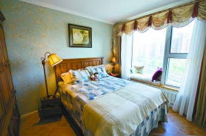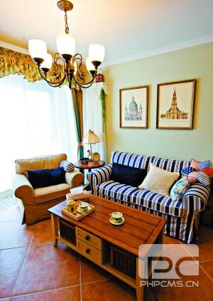 餐厅之后的小客厅,背景墙壁上贴着绿底浅色花朵的壁纸,其他墙壁用色是和壁纸底色相同的豆绿色墙漆。家具均用胡桃色搭配白色,沙发用的是蓝白条的双人小沙发搭配米色单体沙发椅,这样的颜色让人非常舒服,搭配起来清新自然。 主卧面积不算大,一张床和一个衣柜基本上将卧室全占满了。卧室用的是蓝色为主的条纹壁纸,背景墙上用了花朵壁纸,乡村感觉进一步加强。