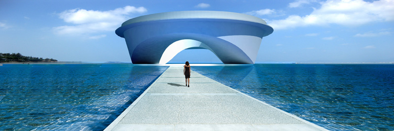 美术馆是直径100m的圆体,全部体积被海平面所托起,对海面形成拱形的视线遮挡。参观者首先会朝这个拱形慢慢接近,到达拱形的下部后,通过在其上方巨大的蜿蜒的拱形曲面贝壳形成充满生机的外部空间。这个曲面贝壳在亚热带气候的海南岛提供了可供通风及遮阳用的舒适的广场,除此之外,这个广场作为一个无与伦比的舞台,也可适用于进行授赏仪式等特别的活动项目,尤其从广场看到的在海平面上呈现的落日景象格外美丽。