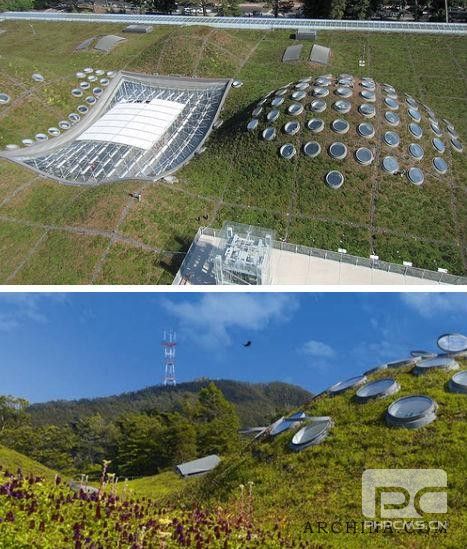 加州科学院“自然曲线”的设计非常富有独创性,是一个令人惊异的建筑项目,从设计到最终成为现实,无不令人惊叹。加州科学院位于曲线前面,拥有自己的玻璃曲线,其绿色小山形屋顶显然是向旧金山的天然地貌致敬。绿色屋顶上生活着包括鸟类和蝴蝶在内的很多野生动物。借助于一个屋顶观景台,游客可以与绿色屋顶亲密接触,同时感受美妙的野生动物带给他们的快乐。