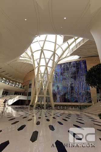据施工方上海建工集团介绍,外观状如"白帽"的这座建筑,设计主题为"凤凰欲飞"。建筑地上部分掩映在大片绿荫中,整体绿化率超过56%。建筑内部充分运用深入地下的树状钢结构和"阳光谷",实现地下剧场的自然采光和通风,尽最大可能节能降耗。特别设计的下沉式环形消防通道,则有助于防灾减灾。