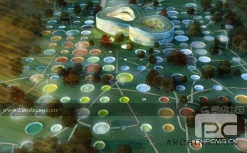 在这块25000㎡的场地上,奥运五环构成了建筑的基本结构。整个方案对五环的位置和大小进行了重新调整组合,其中包括两个悬浮的圆形建筑和三个下沉花园。