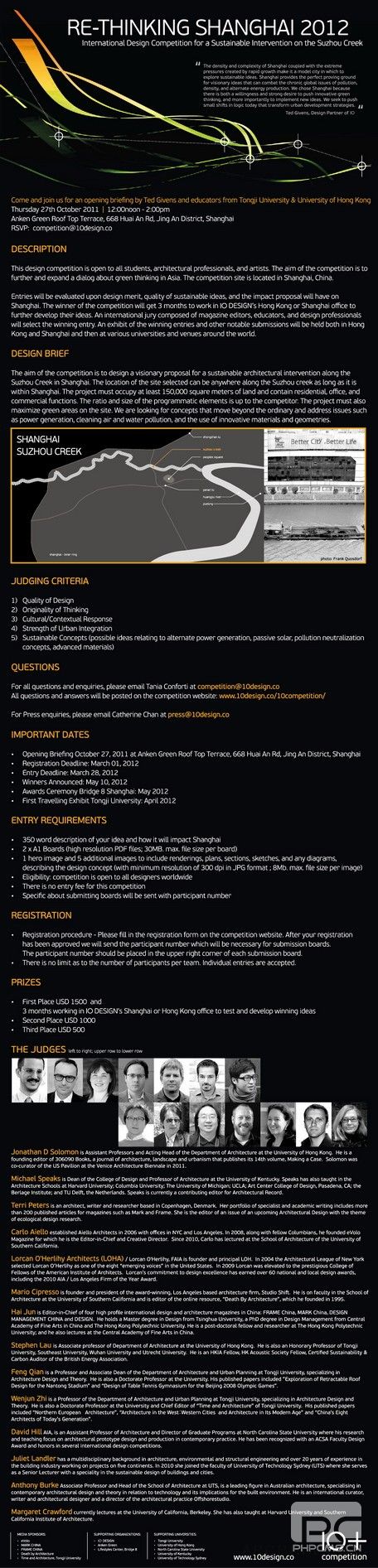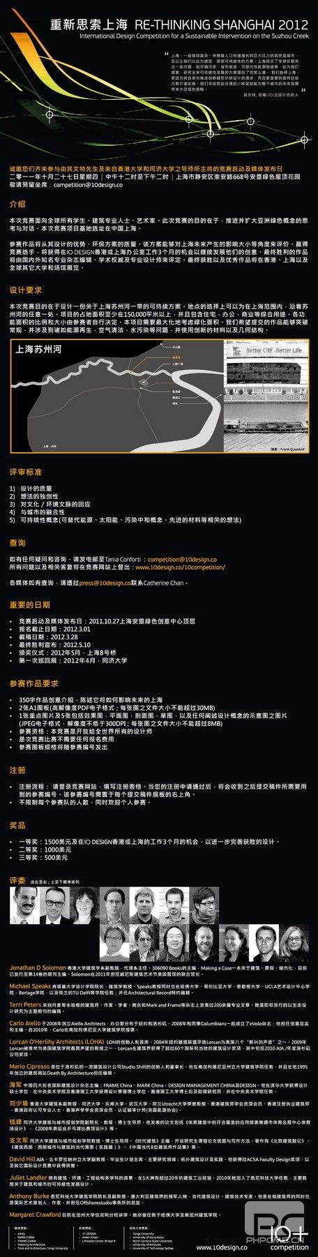 介绍 本次竞赛面向全球所有学生、建筑专业人士、艺术家。此次竞赛的目的在于,推进并扩大亚洲绿色概念的思考与对话。本次竞赛项目基地选址在中国上海。 参赛作品将从其设计的优势、环保方案的质量、该方案能够对上海未来产生的影响大小等角度来评价。赢得竞赛选手,将获得在10 DESIGN香港或上海办公室工作3个月的机会以继续发展他们的创意。最终胜利的作品将由国内外知名专业杂志编辑、学术权威及专业设计师来评定。最终获胜以及优秀作品将在香港、上海以及全球其它大学和场馆展览。 设计要求 本次竞赛目的在于设计一份关于上海苏州河一带的可持续方案。地点的选择上可以为在上海范围内,沿着苏州河的任意一处。项目的占地面积至少在150,000平米以上,并且包含住宅,办公,商业等综合用途。各功能面积的比例和大小由参赛者自行决定。本项目需要最大化地考虑绿化面积。我们希望提交的作品能够突破常规,并涉及到诸如能源再生,空气清洁,水污染等问题,并使用创新的材料以及几何结构。 查询 重要的日期 参赛作品要求 奖品
