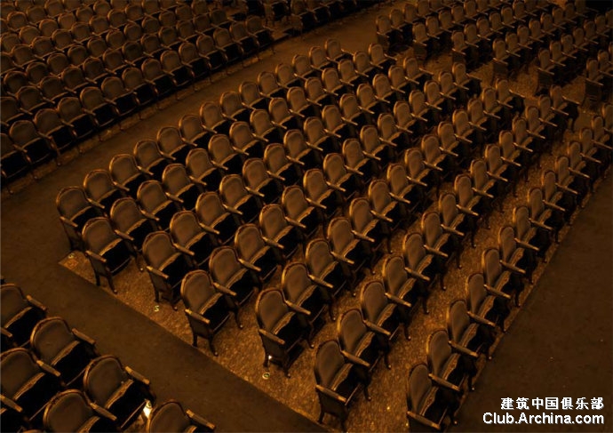而我们脚下的舞台,在1959年改建为音乐厅时深度增加到8.35米,世纪初上海音乐厅的整体平移和修缮工程中,舞台的进深再次大幅增加,现为13.13米,不再是原来为电影院准备的小舞台,更加适应音乐厅的演出要求。而因为舞台的镜框式特征和改建时对原有设计形态的尊重,改建后与原来观众厅的关系并没有明显改变。 很多人是通过《中国达人秀》认识上海音乐厅的。那现代时尚的舞台布景、绚丽的灯光、争奇斗妍的各色达人、善于调动气氛的程雷、评委席上从容点评的周立波和伊能静,那种缤纷热烈与我眼前的音乐厅整体的气氛形成强烈的反差。但当镜头拉远和切换时,那西洋传统的蓝灰、暗黄和金色会从观众眼前掠过。其中出现次数最多的是舞台周边的镜框式描金花饰镶边,金色的周围也有一圈暗色的花饰映衬,以压制浮华的气息而使金色高贵而沉稳。 《中国达人秀》镜头里面上海音乐厅观众厅的这些细部片段,给人的感觉像一个长者包容且不同声色地看着另一个世界的热闹与欢乐。 2. 走出音乐厅,看到的是近几年建成的延中绿地。上海音乐厅在其中显得有些孤单。正是在延中绿地建设过程中,上海音乐厅作为保护建筑,向东南平移66.4米,并在平移前后两次升顶。因为周围的街区被绿地所取代,上海音乐厅也失去了以前街区中的左邻右舍,很难想象曾有过西侧听到街坊叫卖声的岁月。