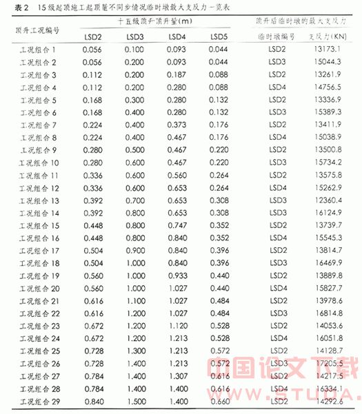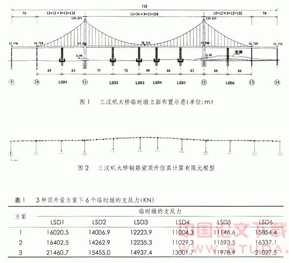 | 1前言 悬索桥由于其自身的美观和经济性在大跨度桥梁建设中得到了广泛应用,其中的自锚式悬索桥由于不需要建设巨大的锚锭,且其桥型优美在大跨城市桥梁建设中开始得到广泛的应用。 2自锚式悬索桥施工流程 大跨度桥梁的分段施工时都要经历一个结构体系的转换过程,体系转换过程前后两个不同结构体系的受力特点和变形特点均不相同,但最终将转化成永久的结构体系-成桥状态[1]。 自锚式悬索桥由于其自身固有的特点,其上部结构的施工顺序为:先采用顶推、分段预制吊装或支架现浇方法施工悬索桥的加劲梁,在主塔及加劲梁均施工完成后进行主缆的安装,然后进行吊索安装,最终完成全桥的体系转换。自锚式悬索桥的体系转换过程,通常采用张拉吊索法来完成[2-3]。张拉吊索法通过在安装吊索的过程中不断调整吊索的连接长度从而使加劲梁的恒载作用逐渐转移由主缆承受,通常张拉吊索法需分三级进行,且需对每根吊杆进行张拉调整,因此施工作业周期长,对于施工机具的占用多,且施工费用较高。落梁法则依靠进行加劲梁施工的临时墩先顶升加劲梁,然后无应力安装所有吊索,最后一次落梁形成体系。显然,落梁法与张拉吊索法相比具有施工周期短,施工机具占用少,施工费用低的优点。 本文结合长沙市三汊矶大桥的施工情况,对一次落梁法成桥的施工技术中需要进行控制的施工参数进行了研究和探讨,对落梁法进行体系转换的施工技术的发展应用具有参考价值。 3三汊矶大桥落梁法施工情况 3.1 三汊矶大桥工程简介 三汊矶湘江大桥是湖南省长沙市二环线上跨越湘江的重点工程。该桥的主跨为五孔的双塔双索面自锚式悬索桥,其总体布置示意见图1;主孔跨径328m,两边孔132m,两次边孔70m。成桥状态矢跨比:中跨为1/5,边跨为1/10.6。加劲梁型式为单箱五室扁平闭口钢箱梁,采用Q345d钢。全桥箱梁分标准梁段、索塔附近区段、主锚锚固段及压重节段。吊索与主缆连接方式为上下销接式,吊索在钢箱梁上的锚固采用通过锚拉板的销接连接。显然,吊索的这种连接方式最为简单,但无法进行吊索的张拉施工,因此无法应用张拉吊索法进行体系转换。 3.2 三汊矶大桥临时墩跨径布置 在三汊矶大桥施工期间,为了满足湘江的通航要求,结合考虑标准钢箱梁的重量(约200t),对钢箱加劲梁采用多点连续顶推方法使其到位,考虑到顶推钢箱梁施工中的安全性和经济性,全桥设置了6个临时墩(编号依次为LSD1~LSD6),其跨径布置见图1。根据滑道布置情况,横桥向设置了2个单独的临时墩,其中心距为22.8m。每个临时墩采用4根Φ1.5m钻孔桩作为基础,再用4根Φ1200×12mm钢管接长至设计标高,4根钢桩之间通过型钢、节点板连接成整体共同受力。为了进行加劲钢箱梁的起顶,在钢桩顶先设置横桥向分配梁,然后分配梁顶设置纵向滑道梁,分配梁及滑道梁均采用钢板焊接制作。在滑道梁两侧设置起顶牛腿,以便在钢箱梁被顶推就位后,可起顶较大高度来安装吊杆。 3.3 三汊矶大桥的落梁法施工简介 对于三汊矶大桥,待全部钢箱梁按照成桥线型标高顶推施工就位后,通过起顶中跨的LSD2-LSD5这4个临时墩顶上事先设置好的顶推滑道,根据空缆与成桥主缆线形的变化情况,将加劲钢箱梁沿竖向起顶一定的高度,使得吊索能在无应力状态下安装就位,待全部吊索安装完成后,逐步落梁至各梁段的成桥设计标高,使主缆和吊杆共同承受原本由4个临时墩承受的钢箱梁荷载,以达到完成体系转换的目的。 4.3.1 临时墩的安全性分析 当4个临时墩各自总的起顶量确定后,需要根据顶升用的千斤顶的行程确定顶升的级数,以及每级各顶升点的顶升控制量等实际施工控制性数据。在确定这些控制性数据时,必须保证起顶施工中各支承墩(临时墩和永久墩)的反力及钢箱梁的应力水平必须控制在允许范围内,因为这些均与起顶量的大小密切相关。为此,需要建立施工阶段仿真分析模型来确定顶升分级数以及每一级起顶量。经过多次模型试算分析发现:当采用15级均匀分级顶升施工时,即使发生个别临时墩顶升量不同步的情况,所引起的支墩反力也不会超过设计承载力,此时临时墩在施工中处于安全状态。分析结果见表2。 4.3.2 钢箱梁的安全性分析 起顶前钢箱梁最大正弯矩为58372KN·m,最大正应力为33.15Mpa;最大负弯矩为-84911 KN·m,最大拉应力为41.12Mpa。在起顶方案2中,最大正弯矩为173236KN·m,最大正应力83.89MPa;最大负弯矩为-238337KN·m,最大拉应力为115.41MPa。另外,LSD2~LSD5之间钢箱梁段均承受负弯矩,形成大范围的底板压应力区段。分析比较顶升前后,可发现钢箱梁的应力水平成倍增长,但依然在许可应力范围之内。 当中跨钢箱梁顶起后,根据数值分析可知:靠近两主塔范围边跨的6个梁段(约60m长)会产生一定程度的下沉,下沉量最大约为70mm,不加调整的话,会对边跨的吊杆安装造成一定的困难。在实际操作过程中,可以对两边孔内LSD1与LSD6这两个临时墩进行适当的起顶,以满足边孔吊杆安装的需要。 ![]() 4.3.3 顶升梁的可行性分析 对安全性的分析表明:采用顶升梁法吊杆安装形成体系的方法是可行的。但在实际操作过程中,要注意:①起顶前要对临时墩的稳定承载力进行认真校核;②起顶施工中千斤顶起落梁时尽量沿桥纵向,使4个临时墩同步均匀进行以确保安全。 5结语 自锚式悬索桥需先行完成加劲梁的施工,因此可以采用落梁法完成体现转换