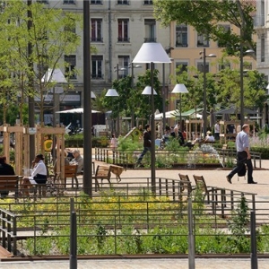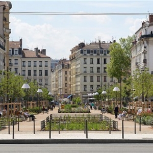 景观设计:Ilex Landscape Architecture 这是由 Ilex Landscape Architecture设计的法国里昂Place Général Brosset住宅区。由于新的宁静交通计划和未来地下停车场的建设,因此在这个区域,未来很有可能会创建一个中央步行公共空间。该项目键槽了一个久负盛名的花园广场,虽然简单,但是极具吸引力。与19世界的建筑和邻近的奥斯曼风格和公寓楼,一同组成令人愉悦的风景。该项目由2个相互环绕的连锁元素组成:首先,该项目中心是一座花园广场,由23万块马赛克拼成,简单又富有条理;其次,外围的外墙包围了整个空间,并将人引向火车站和市中心。这样宽9米的步行街,周围点缀着多家咖啡店和饭店。