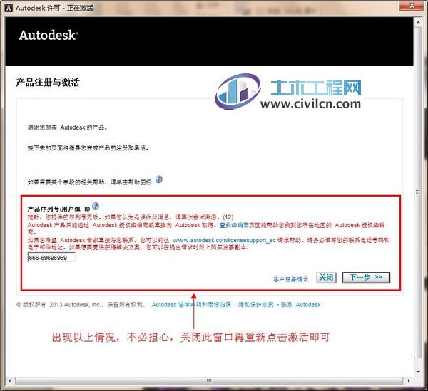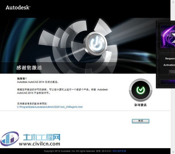 最后复制Activation中的激活码至“输入激活码”栏中,并点击下一步完成激活。这样就完成了Autodesk产品的注册了