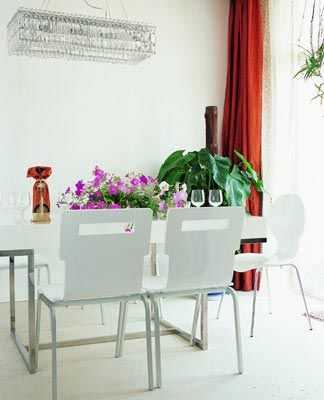客厅与餐厨空间是开放贯通的,白色的钢架桌椅,剔透的水晶吊灯和酒具,一捧盛放的鲜花,格外养眼。 3、客厅的智慧