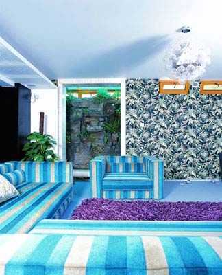 打开听觉、视觉,一切感观。自然的采光景观和绿色墙纸挑起一屋的清雅。深灰蓝地面、条纹沙发支起一墙攀滕。 5、情趣阳光浴室