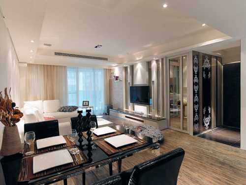 入口端景是餐厅场域,设计师以黑色皮质餐椅搭配黑色烤漆玻璃餐桌,展现低调质感,与客厅白色沙发、墙面交揉出黑白俐落风格。