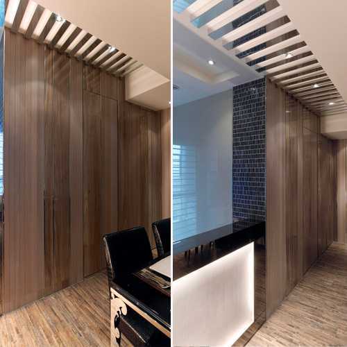 设计师利用不同材质,表现形塑冲突却又协调的空间效果,公共场域仅用间接光源反射异材质光影,铺叙出现代时尚的都会美学。