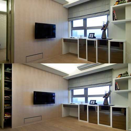 设计师以大片风化木作出次卧抽拉柜体,通铺设计让空间运用更灵活,一旁的书桌同样以白色烤漆玻璃搭配明镜,铺叙时尚风格。