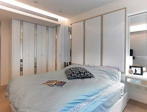 主卧衣柜使用白色烤漆搭配明镜线条,与床头白色绷布共筑明亮视野。
