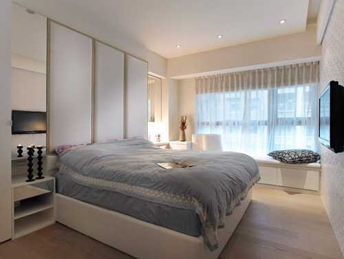 主卧房简单素雅,大片窗台下架高形成卧榻区,坐卧在上,享受悠闲时光;床头以白色绷布绷出简约风格,两旁以对称镜面做出床头矮柜,放大空间效果。