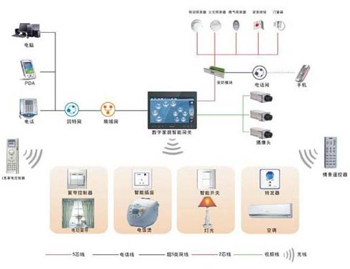 1.家庭网关 家庭智能网关就是家庭的一个智能化控制中心,带有嵌入式处理器和Armlinux操作系统;具有可触摸的TFT液晶显示屏(5~10英寸);有14路报警点输入和2路报警控制输出,发生警情时可通过网络或电话报警;通过网关上的无线射频模块与网络中各子节点进行通讯,实现家电控制;内置了Webserver,通过Web方式实现家电的远程控制。同时家庭网关还具有留影、留言、MP3\MP4播放功能,可方便主人进行温馨留言等。 2.无线射频无线通讯子节点 在不同的控制系统中,无线通讯子节点具有不同的功能: 照明控制,通过无线遥控开关节点实现对灯光开关和调光的功能; 电源控制,通过无线遥控插座实现对电器的电源进行远程控制; 窗帘控制,通过无线窗帘控制器对电动窗帘电机进行远程控制; 家电控制,通过无线红外转发模块对红外遥控家电进行远程控制; 继电器输出控制,实现电动门窗、煤气阀门等I/O控制。 普通家用或商用接收器,通常使用红外线(IF),信号收发要求直线路径,容易受外物遮挡。使用无线射频技术,信号收发不受外物遮挡,凡在系统覆盖范围内,不论任何方位或角度,接收皆准确可靠。此外,信号根据使用地区的不同,由315或434MHz无线频率传输,穿墙越壁,不受任何外物遮挡。系统在开放环境中,覆盖范围可达100米。加上无线射频耗电量低,覆盖面广,无论走到任何角落,操控都是最方便可靠、自由舒心的。 以一所200平方米的住宅为例,室内长约30多米,因此以100米的覆盖范围计算,用户无论走到哪里,各个开关都可接收遥控器的指令,灯光总能配合您的步伐。每个遥控器、开关或调光开关皆装有无线射频发送器或接收器,因此遥控器可直接向各开关发出指令,控制预设的灯光场合,而不需接通任何电线。但是室内30m的遥控距离已经是无线射频技术的最大极限了,如果超过了这个距离,无线信号易受同频干扰,且信号减弱,这也是无线射频技术最大的一个缺陷。 无线射频控制方案 1.灯光控制 无线射频灯光控制系统由智能面板开关和调光器组成,调光器用以发送和接收命令信号,命令通过无线电传播,而不是通过家庭的电源线路传输。每个面板开关都备有一个不同的遥控识别代码。这些代码利用19位识别技术,使接收器能准确辨别每个指令。即使邻居同时使用,也绝对不会因其遥控器干扰而发生传输错误。 调光开关同样内置RF无线射频发射器,能独立于遥控器或移动开关之外,控制落地灯或桌灯的开关或随意调节灯光亮度。调光开关的背面还配有夹子,可自由地夹在电线或其他显眼处,不易遗失,灵活自在。减少干扰,传送或接收指令更加准确无误。 2.无线智能插座 无线智能插座系列主要通过无线射频技术实现对非遥控电器(如热水器、电风扇等)的电源遥控,不仅为这些电器增加了无线遥控的功能,而且还最大限度地节约能源,保障安全。 3.情景遥控模式 情景模式就是一种可以通过预先设置,并可以还原的一种特定的灯光环境。它通过锁定某个灯的开关以及灯光的明暗程度来达到某种特定的灯光环境。比如:离家或睡觉时灯光的全闭、起夜环境、娱乐环境等。情景遥控器不仅可以单独控制某个开关和插座,还可以对家中的整个照明环境进行场景控制。 4.信息家电控制 信息家电控制是一个整合了红外控制和无线控制的多功能遥控系统。它可以控制多达五种红外设备(如:电视机、空调、DVD、功放、窗帘等)和开关、插座等无线设备。信息家电控制系统主要由信息家电控制器和各种智能遥控开关组成。信息家电控制器可以把普通红外电器的遥控器的编码通过学习的方式转存下来从而替代原有的家电遥控器。同时它本身还是无线遥控器,可以发射433.92MHz频率的控制信号,所以它可以控制这个频段的智能开关、智能插座以及无线红外转发器等。 信息家电控制器如何实现对空调的遥控? 空调的红外编码和其他家电的红外编码有很大区别,空调遥控器上每一个按键所对应的红外编码不是固定的。比如按下温度增加或减少的按键,它并不是简单地发送一个固定的温度增加或减少的红外编码,而是向空调发送一个当前工作状态的编码(这个编码包含空调当前是多少度?是制冷还是制热?风速是多少?风向是什么角度?)。所以信息家电遥控器不能只是简单地学习空调遥控器上的几个按键来实现对空调的完全控制。用户只能通过学习空调比较常用的工作状态来达到控制空调的目的。 5.电话远程控制 电话远程控制系统主要是实现通过拨打电话来控制家中的红外电器(主要是空调)和无线开关、插座。可以通过接在电话控制器上的电话机直接进行设置,也可以通过打电话进入设置;通过电话控制器可以控制客厅、书房和卧室等房间的灯光、插座和空调。 下面我们通过一个实际的案例来看看完成一些智能方案需要哪些无线射频产品。 1.户型 三室两厅:主卧、次卧、书房、客厅、餐厅。 2.实现的功能 家居智能家电、照明系统;远程智能控制家电系统(电话、网络);家庭安防系统;可视对讲系统。 3.系统结构图 图中最左边两条竖虚线表示红外遥控信号;其它虚线表示射频遥控信号;带箭头实黑线为安防信号;箭头方向为信号传递方向。在这个图中,我们主要关注家庭部分,小区部分为整体小区工程实施使用。 4.使用到的产品 智能网关 A家庭安全防范功能 提供14路有线防区接入,2路输出;无线撤布防,紧急